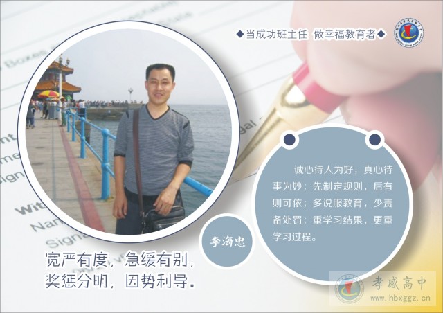 谦虚好学、勤奋踏实,能勤思考、多投入,班级管理工作做到量化与人性化,并卓有成效。懂得享受工作,所以自得其乐。他把工作中的反思与困惑,当作不断前进与完善的动力。面对生活,笑对困难,积极面对,他不断重新塑造着教师自我的过程,也是他逐步成长为一为优秀的班主任的过程。