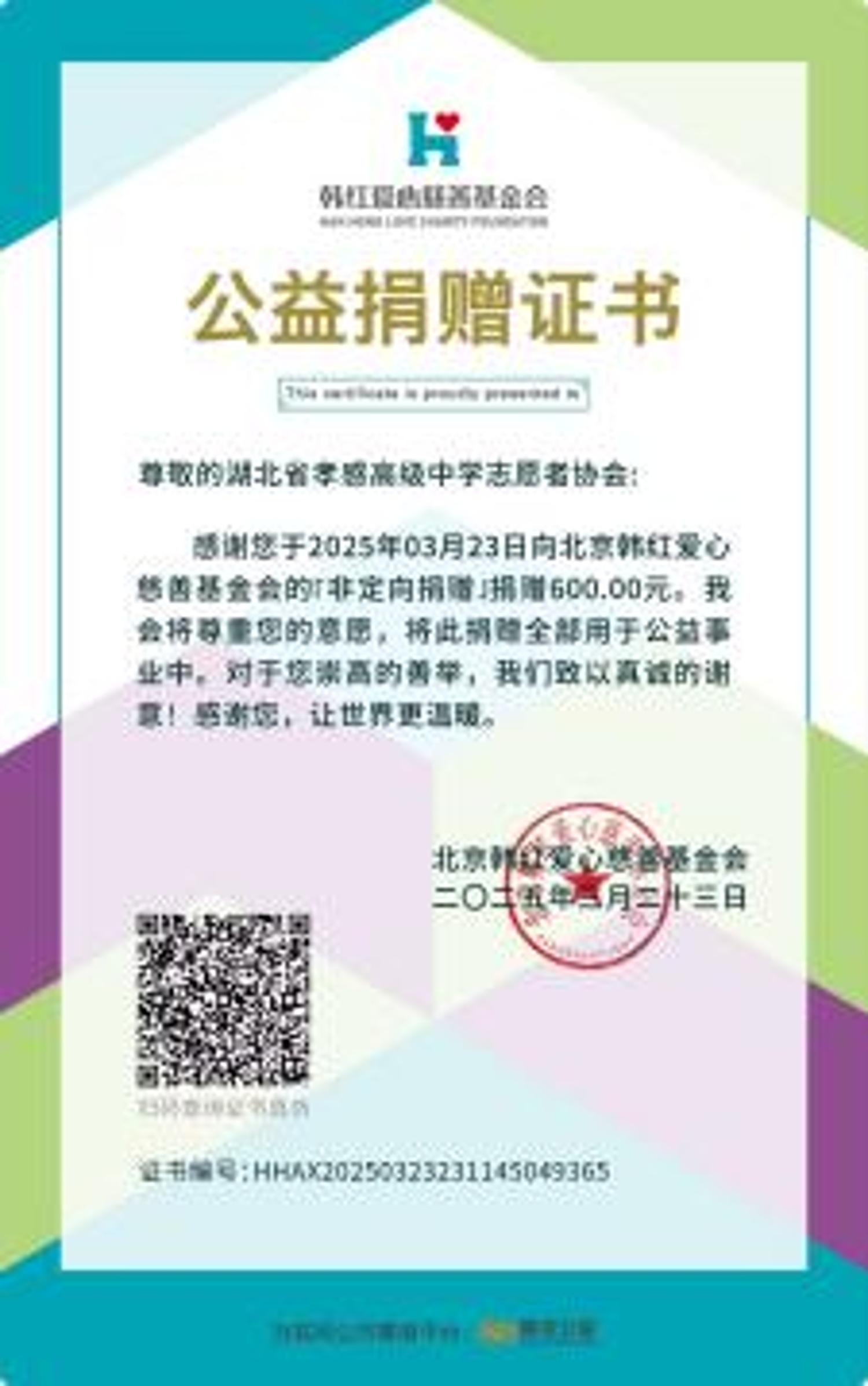 正如韩红基金会的誓言:“每一本流转的书籍,都在书写新时代青少年的责任篇章。”从澴川大地的“红马甲”到贫困山区的爱心捐款,孝感高中志愿者协会以书为媒,将孝爱之城的温暖传递至祖国有需要的地方。未来,孝感高中志愿者协会将继续开展各类公益活动,传递温暖,播撒爱心,展现时代青年的靓丽风采!